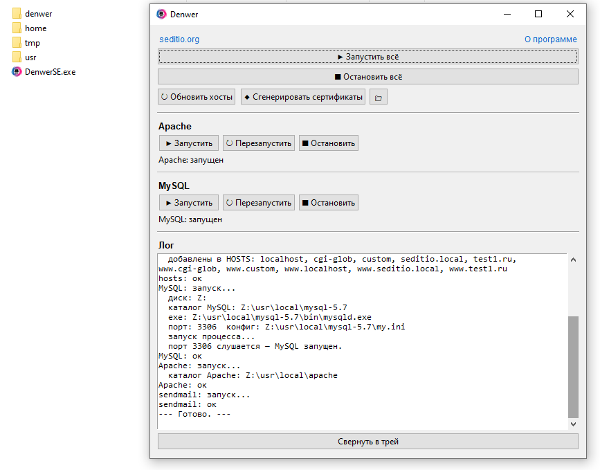 Это неофициальная версия Денвера, собранная разработчиками CMS Seditio для нужд сообщества. Вы можете спокойно использовать сборку для личных целей.